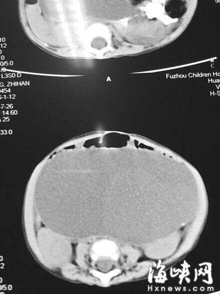 7月22日,家人抱著小云到福州兒童醫(yī)院,福州兒童醫(yī)院副院長(zhǎng)、小兒外科學(xué)博士林芃一摸她肚子,推斷可能是巨結(jié)腸或腫瘤。果然,B超結(jié)果顯示,小云 的左側(cè)腹膜后藏著一個(gè)巨大腫瘤,被腸管擋住了,為此多次漏診。腫瘤直徑約20厘米,幾乎霸占整個(gè)腹腔。7月29日,醫(yī)生花了3個(gè)小時(shí)剝離腫瘤,其皮質(zhì)硬。 醫(yī)生將瘤中的液體吸出500多毫升,“排球”癟了1/3,才被順利取出。這是一個(gè)畸胎瘤,足有2斤重,這么大的很罕見(jiàn)。但畸胎瘤分化不成熟,沒(méi)有成形的毛 發(fā)、牙齒等組織,很可能是惡性腫瘤,目前還在等病理報(bào)告。