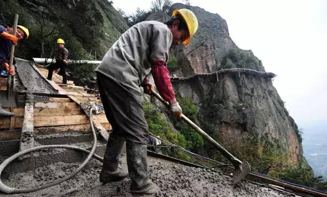 負責運送水泥和沙石的工人,每次都是用小車推著近百斤重的沙石,而沉重的木板,幾乎需要人工背著……他們走在搭建在幾百米甚至更高的空中木板路上,運輸著修路所需的材料。