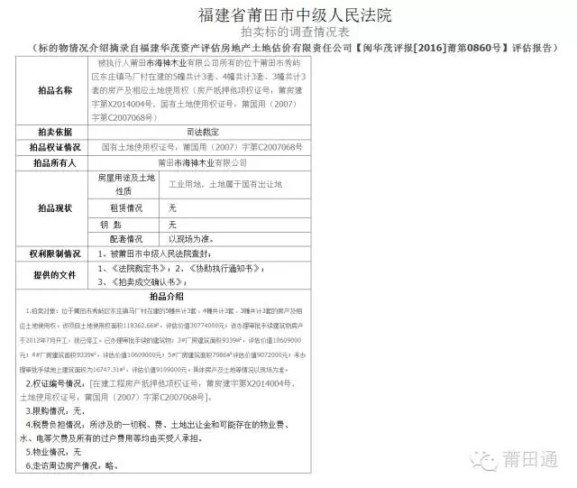 秀嶼區(qū)東莊鎮(zhèn)馬廠村在建的5幢共計3套、4幢共計3套、3幢共計3套的房產及相應土地使用權。該項目土地使用權面積118362.66㎡,評估價值30774000元;該辦理審批手續(xù)建筑物房產于2012年7月開工,現(xiàn)已停工。已辦理審批手續(xù)的建筑物:3#廠房建筑面積9339㎡,評估價值10609000元;4#廠房建筑面積9339㎡,評估價值10609000元;5#廠房建筑面積7986㎡評估價值9072000元;未辦理審批手續(xù)地上建筑面積為16747.31㎡,評估價值9109000元。具體房產及土地等情況以現(xiàn)場為準。
