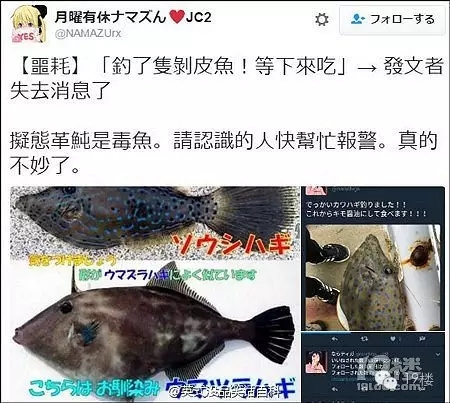 不過,眼尖的網(wǎng)友發(fā)現(xiàn),這位老兄釣的魚并不是剝皮魚,而是內(nèi)臟有劇毒的擬態(tài)革鲀,其毒性是河豚的五十倍。