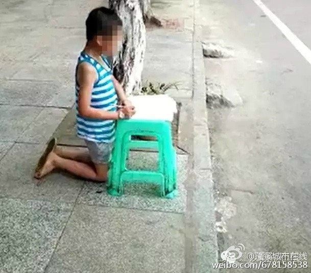 從爆料人提供的圖片可以看出,被打的小孩大約在8歲左右,雙腿跪在地上,用一根膠凳子支撐著做作業(yè),孩子的手上和腿上有明顯傷痕和淤青。