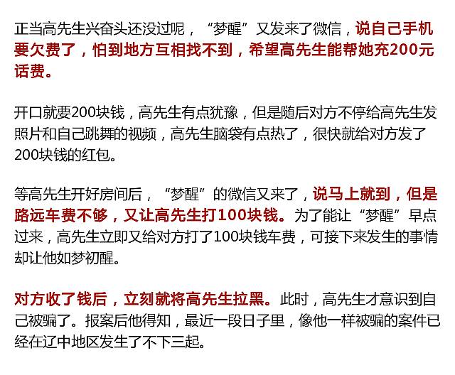 高先生是遼寧撫順一家公司的業(yè)務(wù)員,不久前他到遼中出差。晚上和客戶吃完飯后,他就一個人回到了賓館。正在高先生感覺無聊的時候,突然微信上有人加他好友。高先生打開微信一看,對方網(wǎng)名叫“夢醒”,看頭像是個不折不扣的“美女”。于是,高先生就同意了對方加好友的請求。