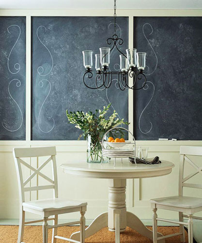 直接將墻面涂成黑色,成為一塊黑板,在黑板上描繪上曲線的粉筆線條,使這個(gè)空間呈現(xiàn)出小酒館的味道。在墻面上還擺放上小粉筆和小黑板擦,可以隨時(shí)改變圖案,趣味十足呢。